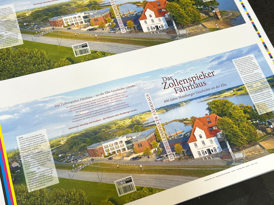 Aber es ist ein tolles Gefühl, das Werk an dem so lange gearbeitet wurde und das jetzt endlich ins Lebens entlassen werden soll, auf den letzten Stufen zu begleiten. Ja, klingt eigenartig, aber es ist immer wieder eine Geburt. Man sieht wie aus einer Idee ein Produkt wird - an dem nun nichts mehr zu ändern ist, und das so wie es ist, in die Welt entlassen wird. Da ist es schon ein sehr schönes Gefühl, zu wissen, dass dieser "Geburtsvorgang" in guten und erfahrenen Händen liegt. Und das betrifft sowohl die Druckvorbereitung, als auch die Papierbeschaffung und den Druckvorgang als solches, bei dem inzwischen vieles automatisiert scheint, doch nichts geht ohne die Drucker mit ihrem geschulten Auge, die den Farbauftrag noch feinstens nachjustieren. Und dann die Arbeit der Buchbinder. Auch dafür haben wir wieder eine ausführliche Arbeitssitzung mit unserer wunderbaren Betreuerin Julia verbracht. So dass wir am Ende glücklich mit all den handwerklichen Schritten vertraut waren und jede Menge Entscheidungen getroffen haben, die nicht mal eben wieder rückgängig zu machen sind, und die dazu gehören, um aus einer Idee ein hochwertiges Produkt zu machen: Papier, Bindung, Hardcover-Umschlag mit rundem Rücken, Leineneinband mit Stempel (wusstet ihr, wieviel verschiedene Goldtöne dafür zu Verfügung stehen?). Dann das Vorsatzpapier, dass unbedingt mit dem Rotton im Inneren des Buches matchen sollte - und dann natürlich auch das Kapitalband und das Lesezeichen-Fähnchen: Alles in zauberhaftem Weinrot. Und umgeben ist das Ganze von einem Schutzumschlag mit einer Panorama-Luftaufnahme, das die ganze Szenerie des Zollenspieker Fährhauses auf einem Umschlag mit Klappen verteilt. Auch nicht ganz ohne, so ein Foto als Titelmotiv vorzubereiten. Aber nun ist alles passiert. Und das Ergebnis sieht sagenhaft gut aus.